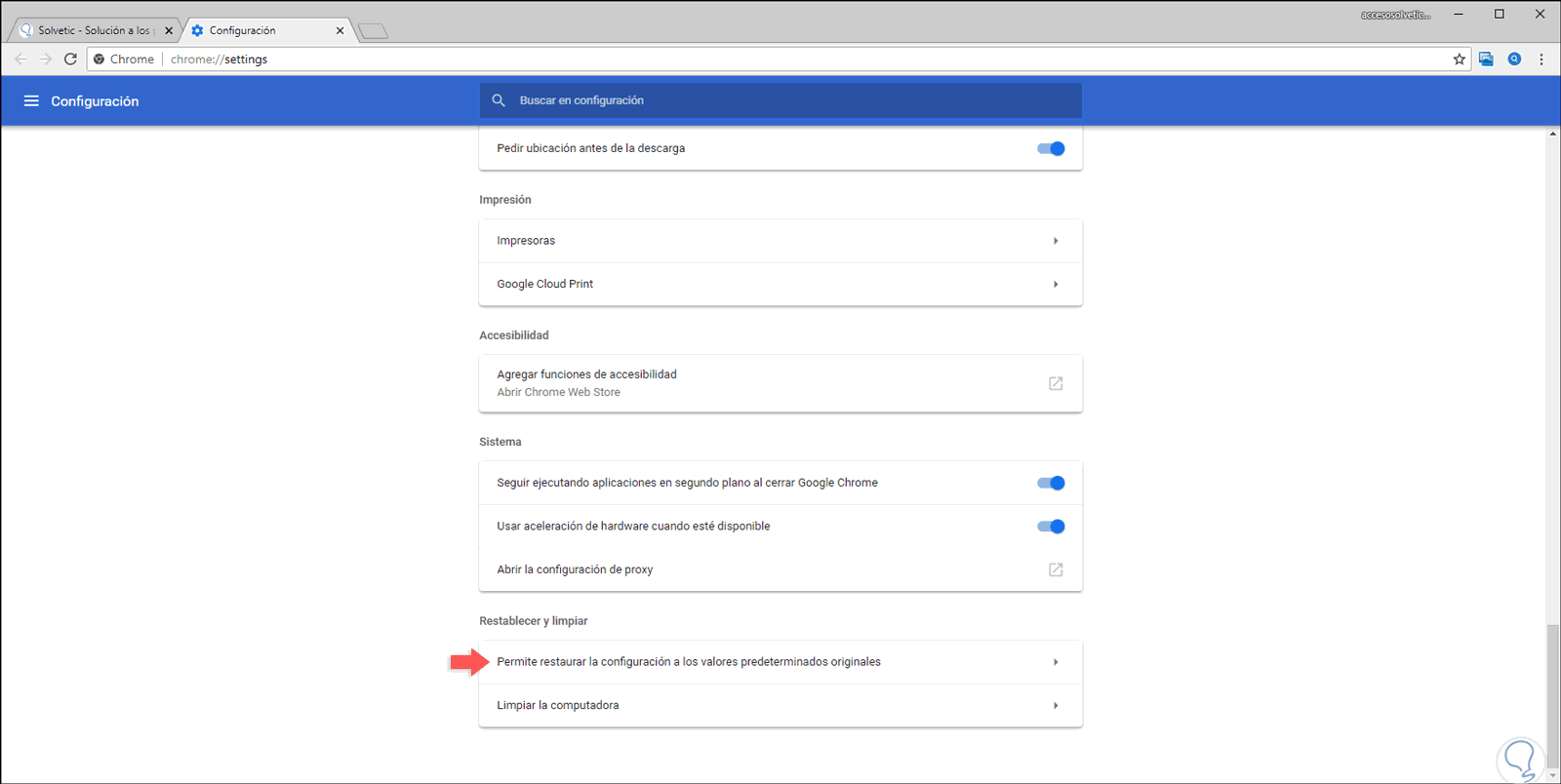 En la ventana desplegada iremos a la parte inferior y allí pulsamos en la línea “Avanzada” y en la sección “Restablecer y limpiar” seleccionamos la opción y allí pulsamos en la línea “Permite restaurar la configuración a los valores predeterminados originales”:
