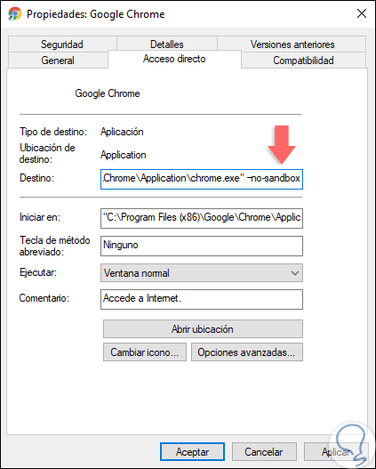 Para deshabilitar este modo en Google Chrome, daremos clic derecho sobre el icono de Google Chrome en el escritorio y seleccionamos Propiedades, en el campo “Destino” añadimos al final del texto la línea “–no-sandbox”. Pulsamos en el botón “Aplicar y Aceptar” para guardar los cambios.