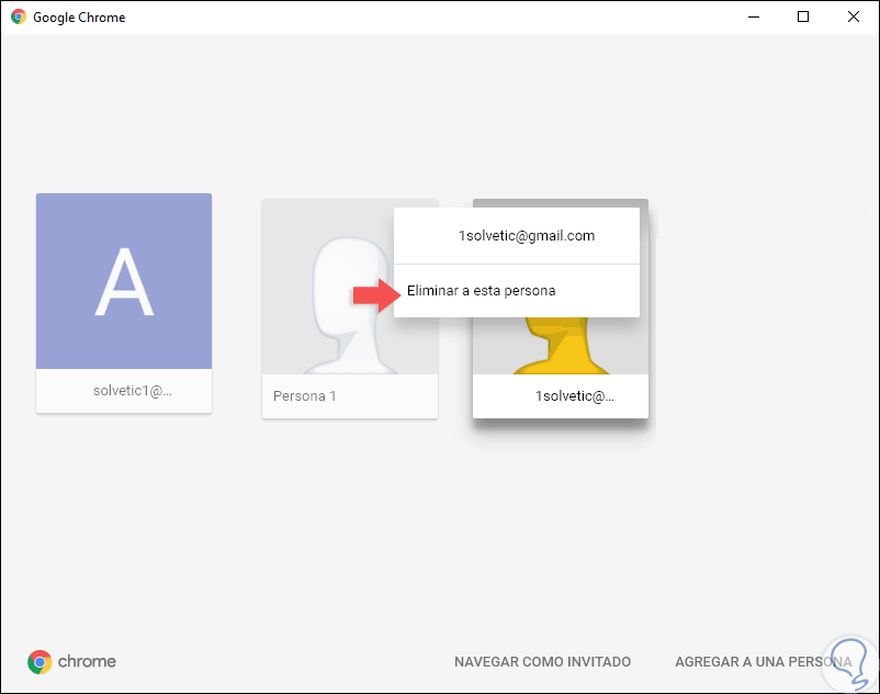 Allí damos clic en la línea “Administrar otras personas” y en la ventana emergente pulsamos sobre el menú de cada perfil y seleccionamos la línea “Eliminar a esta persona”. Así haremos con cada perfil que deseemos eliminar.