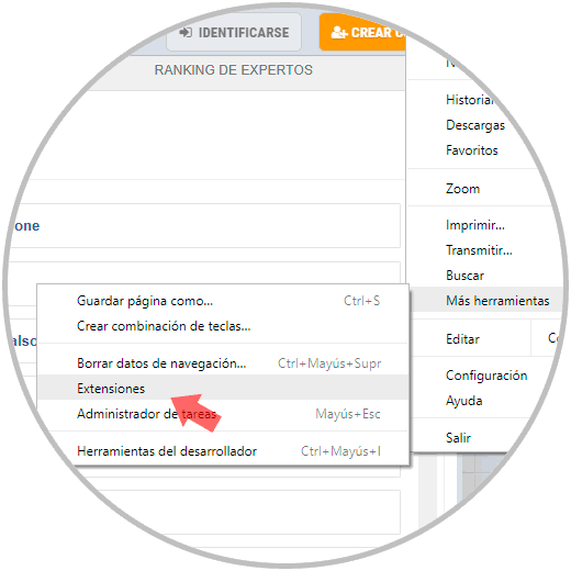 Para esto accedemos a Google Chrome y allí vamos al menú Personaliza y controla Google Chrome y seleccionamos la opción “Más herramientas / Extensiones”:
