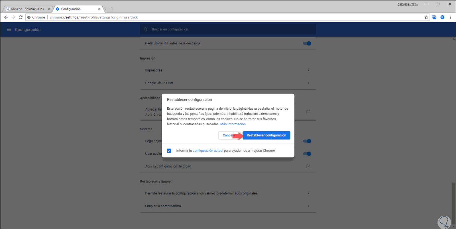 Sera desplegado el siguiente mensaje. Pulsamos en el botón “Restablecer configuración” para llevar a cabo la acción.