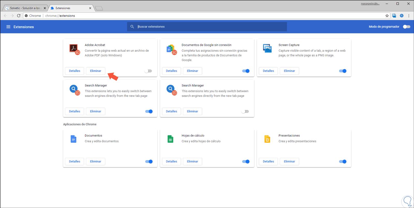 En la ventana desplegada pulsamos sobre el botón “Eliminar” en las extensiones que consideramos están causando algún efecto negativo en el perfil de Google Chrome: