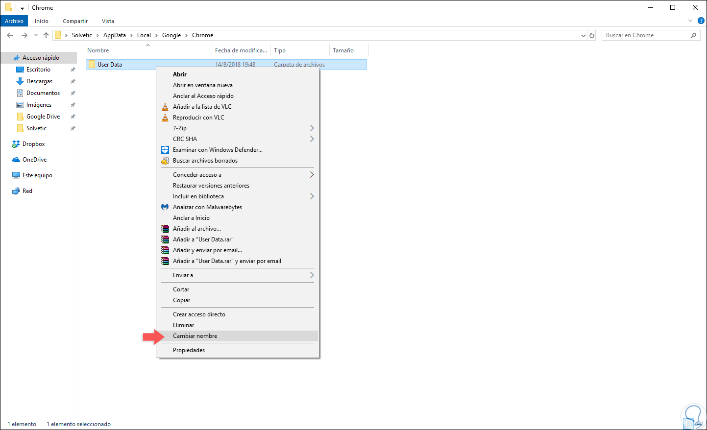 Sera abierta la siguiente ventana en el Explorador de archivos de Windows 10 y allí daremos clic derecho sobre la carpeta “User Data” y seleccionamos la opción “Cambiar nombre”. Renombraremos esta carpeta con el nombre “Backup Default”, de este modo haremos que Google Chrome cree un nuevo perfil predeterminado y descarte el anterior y así se corrija el anterior.