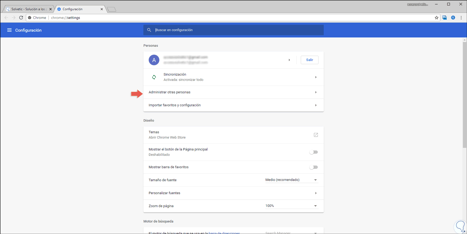 Para eliminar un perfil en Google Chrome, pulsamos en el menú del navegador y seleccionamos la opción “Configuración” y en la ventana desplegada vamos a la sección “personas” donde veremos lo siguiente:
