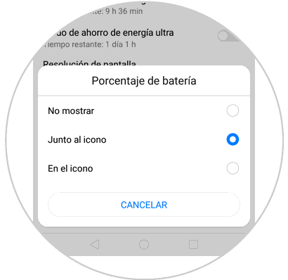 De este modo vamos a poder seleccionar cómo queremos que se muestre el porcentaje de batería de nuestro Huawei P20 Lite.