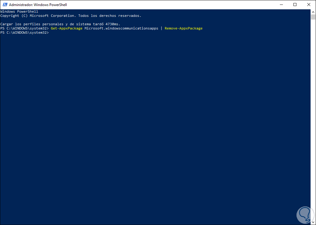 Get-AppxPackage Microsoft.windowscommunicationsapps | Remove-AppxPackageAl pulsar Enter se dará inicio al proceso de eliminación de la aplicación en Windows 10