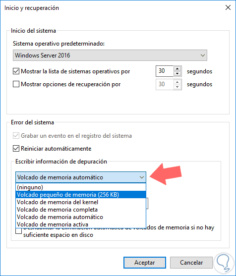 En la sección "Escribir información de depuración" será posible crear un archivo donde se aloje la información sobre del problema generado, al pulsar en la lista desplegable veremos lo siguiente: