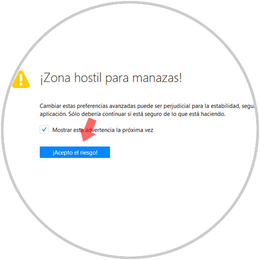 about:configSerá desplegado el siguiente mensaje. Pulsamos en el botón "Acepto el riesgo"