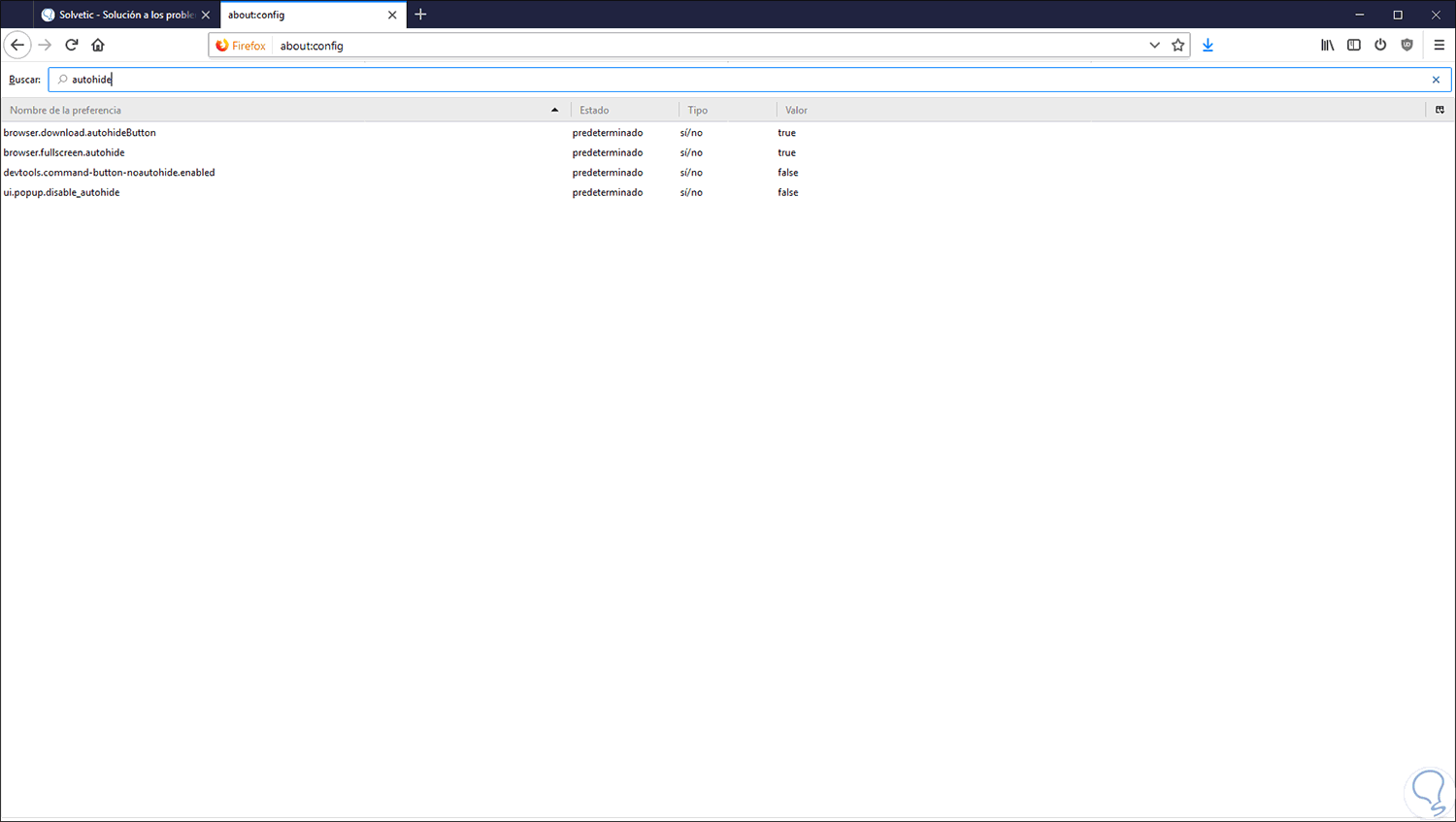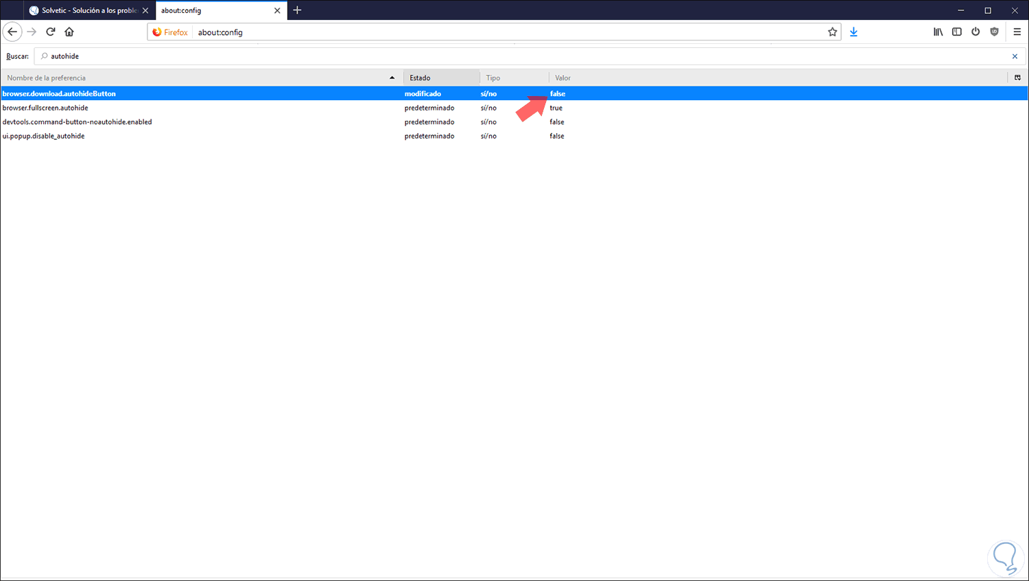 Allí daremos doble clic en la línea browser.download.autohideButton para que el tipo en la columna "Valor" pase de "true" a "false":