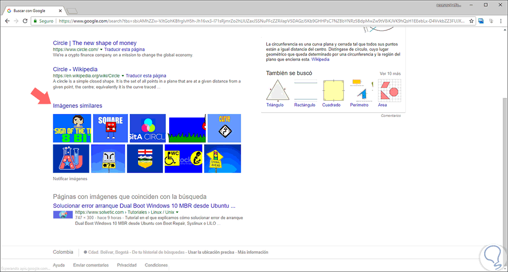 Esto hará que el navegador por defecto sea abierto con los resultados los cuales pueden incluir imágenes similares, sitios que incluyen dicha imagen y otros tamaños de la imagen seleccionada: