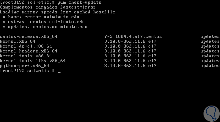 Dentro de esta categoría podemos usar el comando yum check-update con el fin de comprobar si hay actualizaciones disponibles para los paquetes instalados. Como resultado yum devuelve una lista de todas las actualizaciones de todos los repositorios, en caso de que haya alguno disponible: