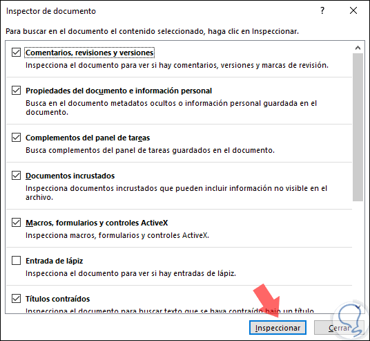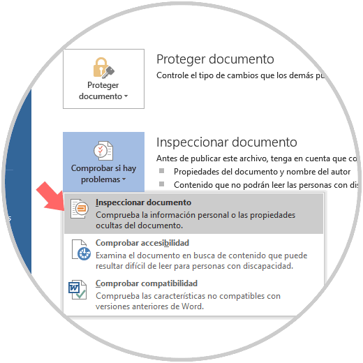 Para llevar a cabo este proceso, vamos al menú "Archivo / Información" y allí damos clic en el botón "Comprobar si hay problemas" ubicado en la sección "Inspeccionar documento" y seleccionamos la opción "Inspeccionar documento":