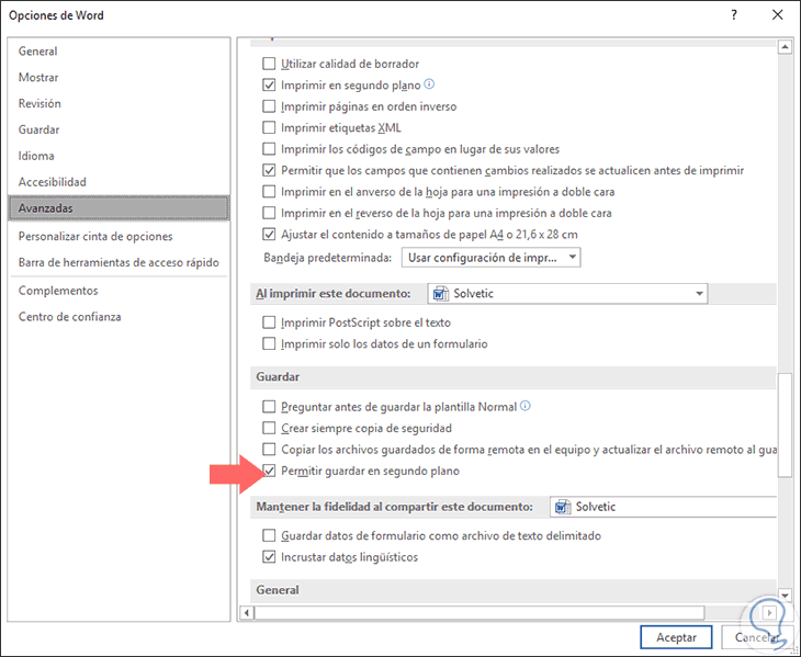 Esta función implica el uso de un poco más de tamaño del archivo de modo que si deseamos deshabilitar esta función para acceder a mejores niveles de tamaño, debemos ir a la ruta "Archivo" > "Opciones" y allí, en la sección "Avanzadas", vamos a la categoría "Guardar" y desactivaremos la casilla "Permitir guardar en segundo plano". Pulsamos en "Aceptar" para aplicar los cambios.