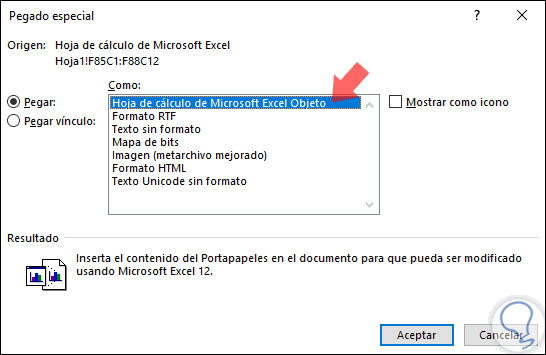 En la ventana desplegada seleccionamos la línea "Hoja de calculo de Microsoft Excel Objeto". Pulsamos en "Aceptar" y de este modo se ha vinculado el elemento.