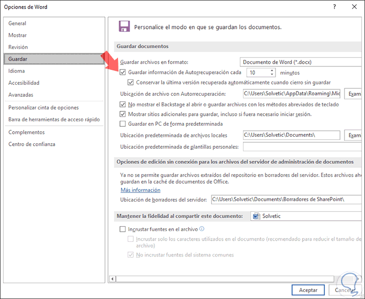 8. Deshabilitar función de autorrecuperación para reducir tamaño de documento Word 2019, 2016