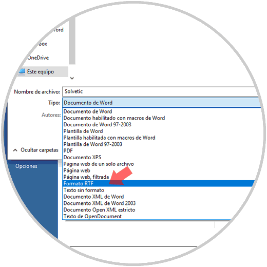 Para esto, basta con ir a la opción "Guardar cómo" y en la sección "Tipo" seleccionar "RTF o HTML". Pulsamos en "Guardar" para aplicar los cambios.