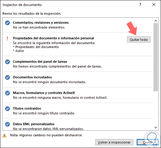Tan pronto el proceso finalice veremos los respectivos resultados, allí podemos pulsar en el botón Quitar todo de cada sección, si aplica: