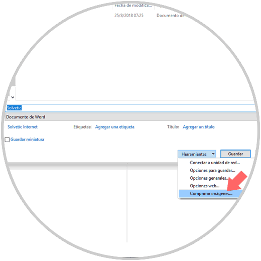 En la ventana desplegada, pulsamos en el botón "Herramientas" ubicado en la parte inferior derecha y allí seleccionamos la opción "Comprimir imágenes":