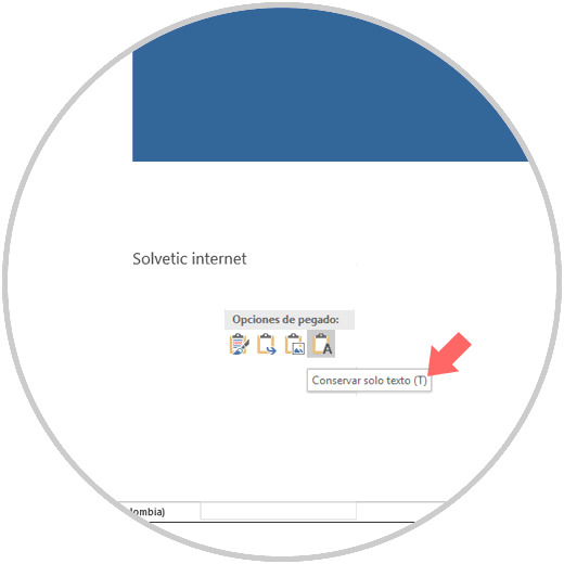 Para evitar que la información copiada sea pegada con su formato, demos dar clic derecho y seleccionar la opción "Conservar solo texto". Así, pegaremos el texto sin copiar formato de origen.