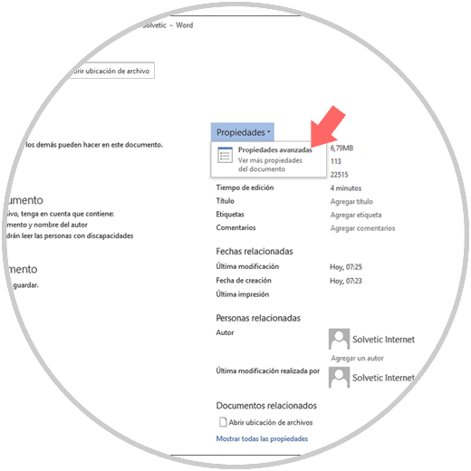 Para evitar que Microsoft Word realice este proceso, vamos al menú "Archivo" y allí, en la sección "Información", damos clic en el botón "Propiedades" y damos clic en la opción "Propiedades avanzadas":