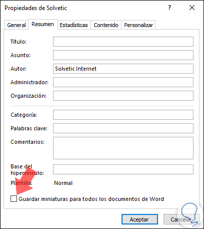 En la ventana emergente, iremos a la pestaña "Resumen" y allí desactivamos la casilla "Guardar miniaturas para todos los documentos de Word". Pulsamos en el botón "Aceptar" para aplicar los cambios.
