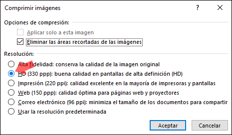 Allí ir a "Formato" > "Comprimir imágenes", y se desplegará la siguiente ventana donde seleccionaremos la calidad de compresión y podemos definir si solo será aplicado a la imagen actual o a todas en el documento: