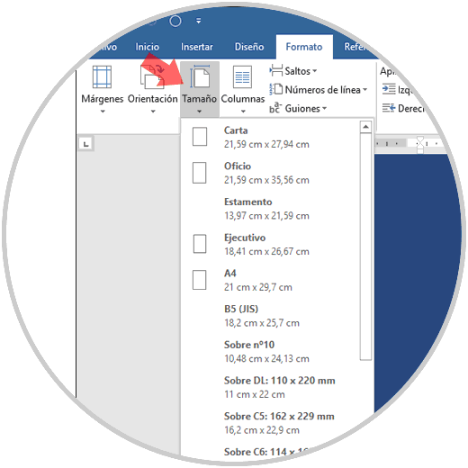 Para definir el nuevo tamaño del documento iremos al menú "Formato" y en la sección "Configurar pagina" pulsamos sobre la opción "Tamaño" y allí seleccionamos la mejor opción según sea el caso: