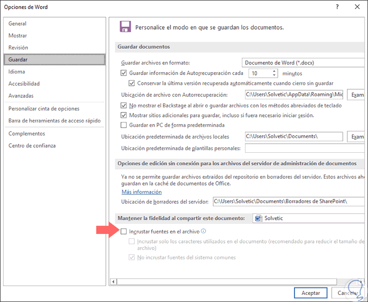 Para evitar que Word descargue estas fuentes automáticamente, vamos al menú "Archivo" > "Opciones" y en la ventana emergente seleccionamos la sección "Guardar" y allí desmarcamos la casilla "Incrustar fuentes en el archivo". Pulsamos en "Aceptar" para aplicar los cambios.