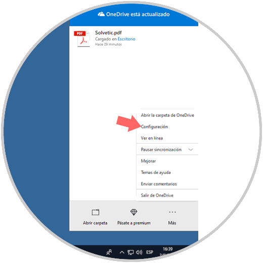 Para llevar a cabo este proceso en Windows 10, daremos clic derecho sobre el icono de OneDrive ubicado en la barra de tareas y en las opciones desplegadas seleccionamos "Configuración":