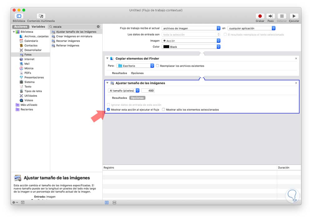 Allí arrastramos al panel central la opción "Ajustar tamaño de las imágenes" y se verá lo siguiente: