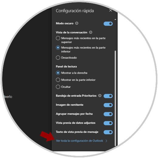 Una vez iniciemos sesión, pulsamos en el icono de engranaje y seleccionaremos la línea "Ver toda la configuración de Outlook":