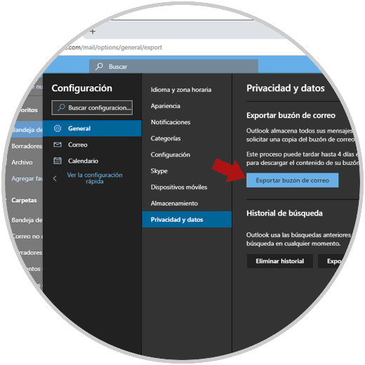 En la ventana desplegada iremos a la sección "General" e iremos a la categoría "Privacidad y datos" y pulsamos sobre el botón "Exportar buzón de correo":