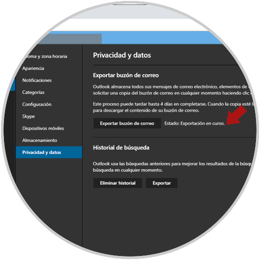 Al pulsar en este botón veremos que inicia el proceso de exportación de nuestro buzón. Outlook.com se encargará de preparar la copia de seguridad en un promedio de cuatro días y luego de esto enviará un correo electrónico con un enlace para descargar el buzón en la misma sección "Privacidad y datos". Después de este periodo, daremos clic en el enlace "Descargar" con el fin de iniciar el proceso de descarga del buzón que contiene los correos electrónicos, contactos y elementos del calendario.
