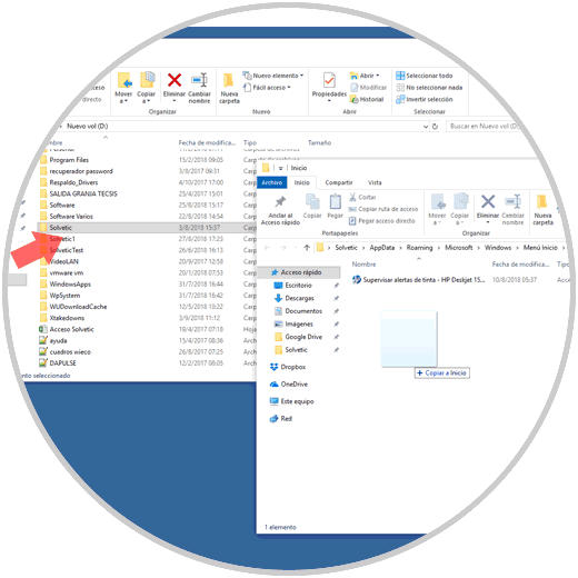 Ahora debemos crear un acceso directo en la carpeta que apunte hacia este inicio de Windows 10. Para ello podemos dar clic derecho sobre la carpeta que deseamos sea abierta y arrastrarla hacia la carpeta de inicio de Windows 10: