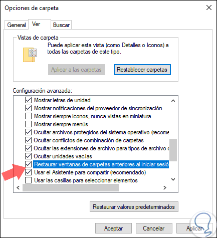 En la ventana desplegada iremos a la pestaña "Ver", y allí activaremos la casilla "Restaurar ventanas de carpetas anteriores al iniciar sesión". Pulsamos en el botón "Aplicar" y luego en "Aceptar" para guardar los cambios.