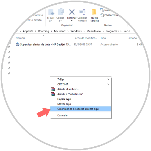 Una vez la soltemos en la carpeta de inicio, veremos las siguientes opciones. Seleccionamos la línea "Crear icono de acceso directo aquí".