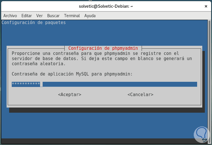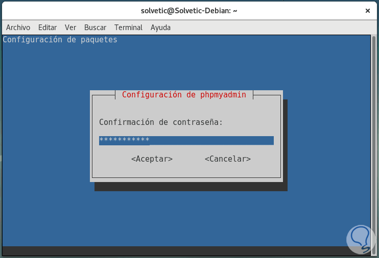 Luego confirmaremos la contraseña del usuario root para la base de datos. Con esto culmina el proceso de instalación de phpMyAdmin.