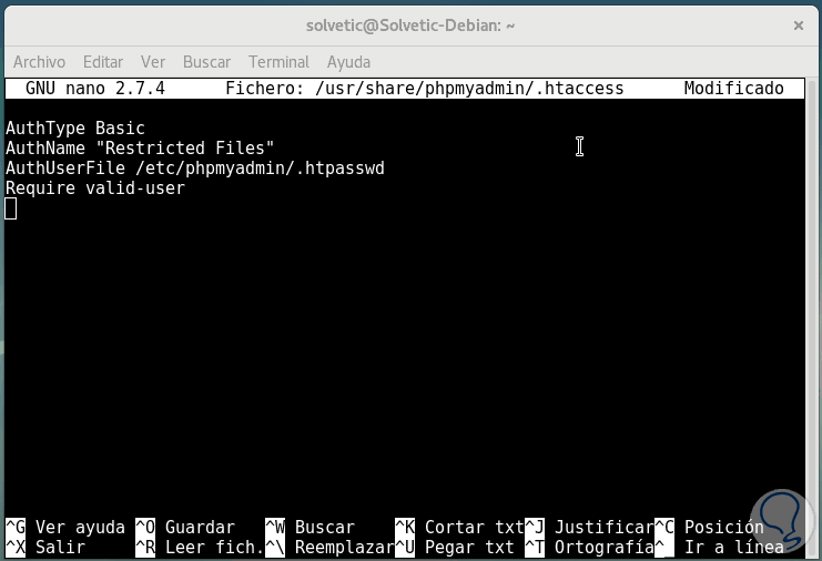 sudo nano /usr/share/phpmyadmin/.htaccessEn el nuevo archivo pegaremos lo siguiente: