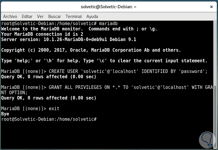 GRANT ALL PRIVILEGES ON *.* TO 'usuario'@'localhost' WITH GRANT OPTION;Salimos de la base de datos: