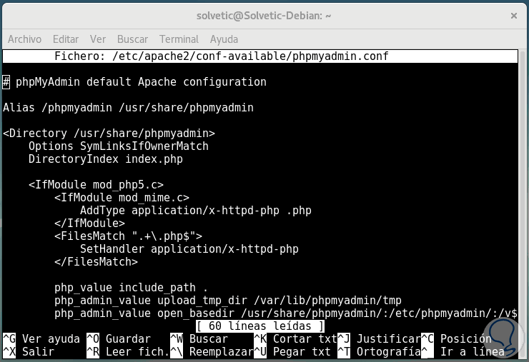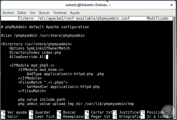 Allí ingresaremos la siguiente línea en la sección <Directory /usr/share/phpmyadmin>: