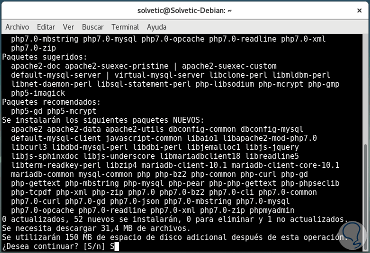Allí ingresaremos la letra S para confirmar la descarga e instalación de PHP y durante este proceso se desplegará lo siguiente: