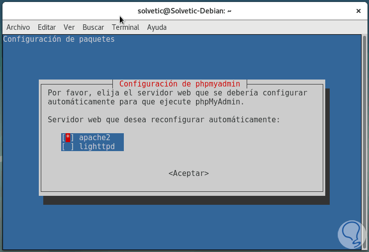 Allí seleccionamos apache2 como el servidor web, para esta selección pulsamos la tecla Espacio y con la tecla Tab seleccionamos Aceptar, pulsamos Enter para continuar con el proceso de instalación: