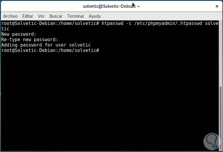 La ubicación que hemos seleccionado para el archivo de contraseña es /etc/phpmyadmin/.htpasswd, vamos a crear este archivo y asignarlo a un usuario inicial usando la utilidad htpasswd: