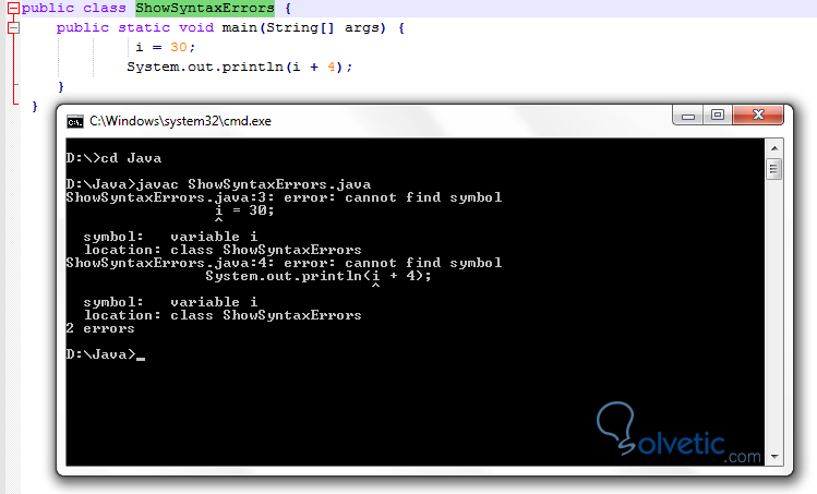 Este tipo de errores es sencillo de depurar ya que Java al momento de compilar nos dice dónde está el problema y nos da una descripción del mismo, veamos el siguiente código con errores:
