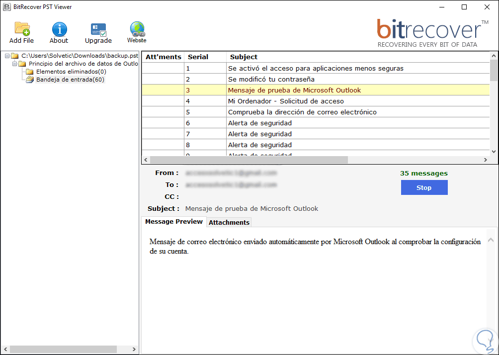 Allí pulsamos en el botón “Add File” para añadir nuestro archivo .pst el cual una vez seleccionado desplegara toda la serie de correos en formato de árbol y tendremos una vista previa de cada uno de ellos: