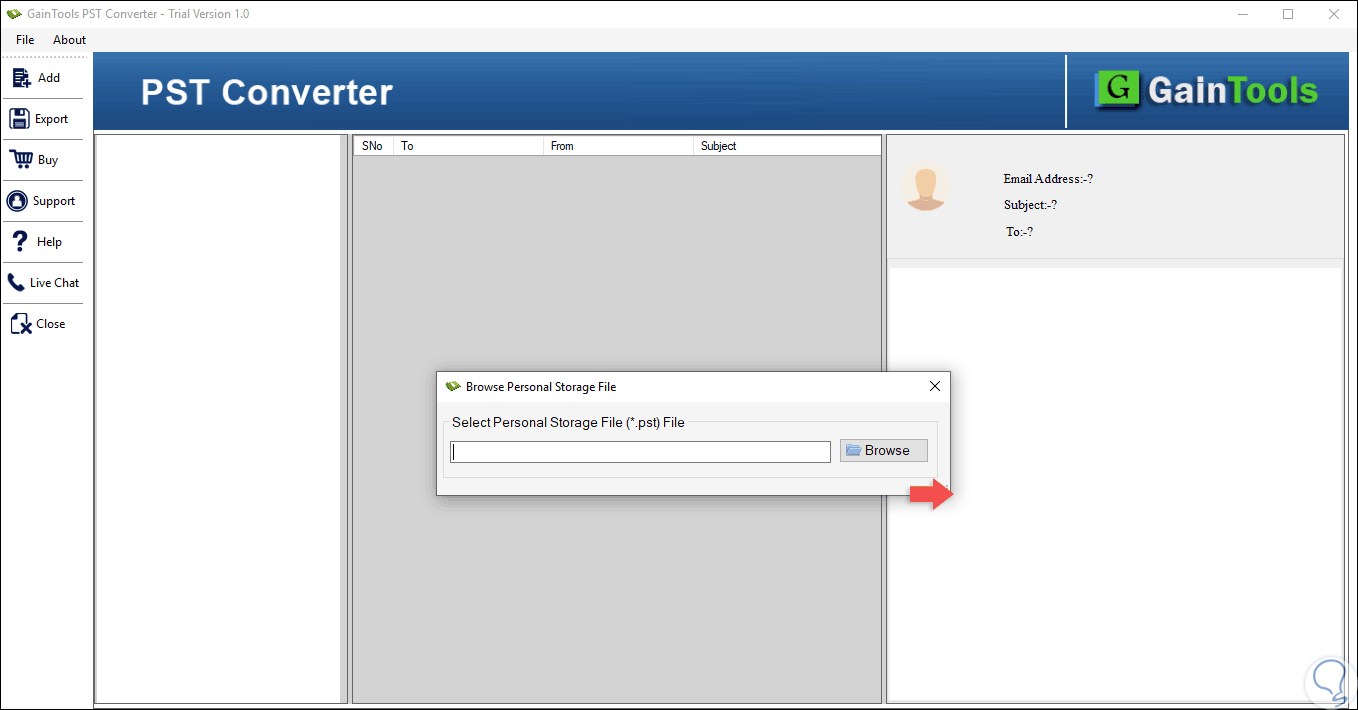 Una vez accedamos a la aplicación será desplegada la siguiente ventana emergente donde seleccionaremos el archivo .pst a usar:
