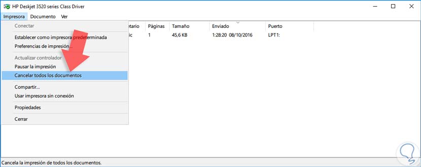 En la ventana que aparece pulsaremos en "Impresora" y elegiremos "Cancelar todos los documentos". De esta forma pararemos la cola de impresión activa.