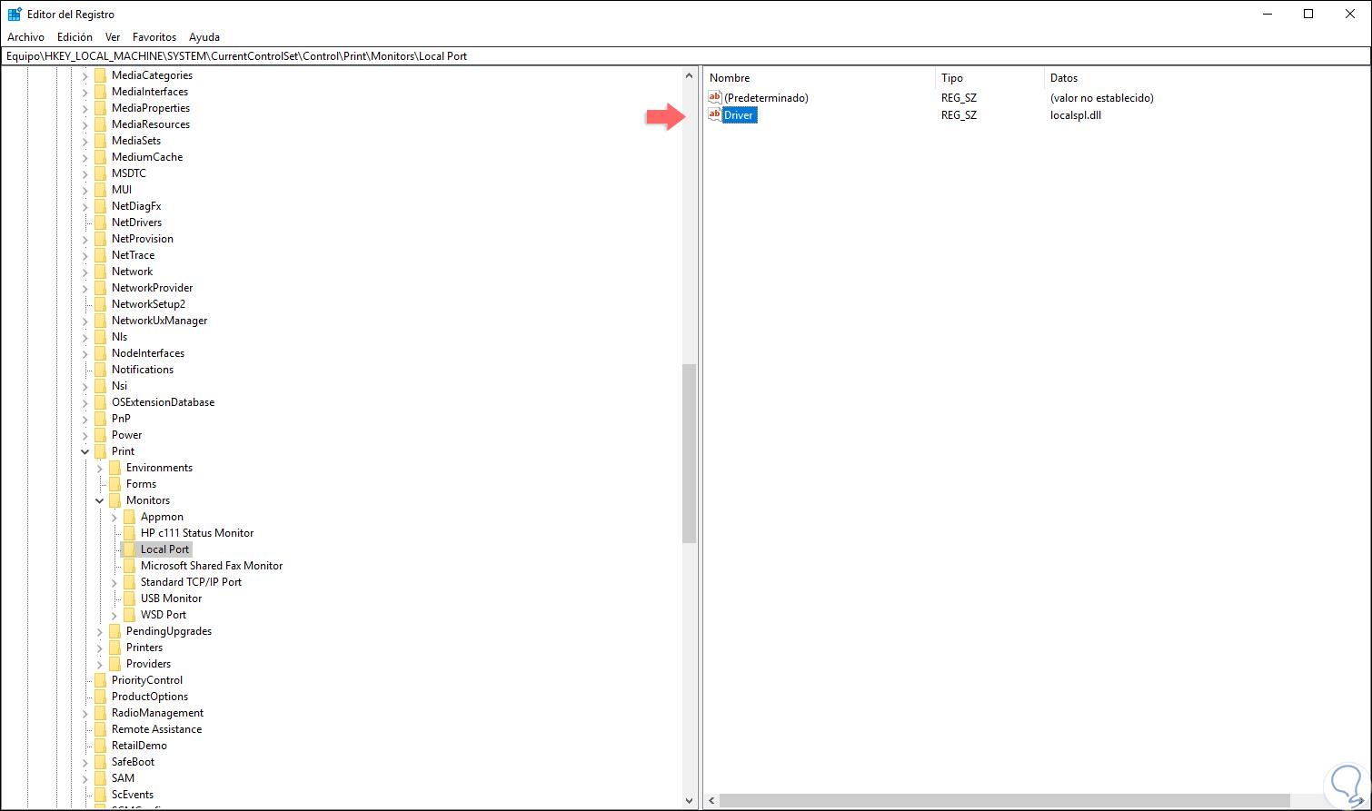 Allí comprobamos que exista la clave “Driver” y que su valor sea “localspl.dll”: