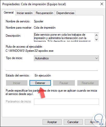 Otra de las opciones con las cuales contamos es llevar a cabo algunas tareas sobre los valores por defecto de la impresora, en primer lugar, accedemos a las propiedades del servicio como hemos visto y allí pulsamos en el botón “Detener” para desactivar el servicio de impresión: