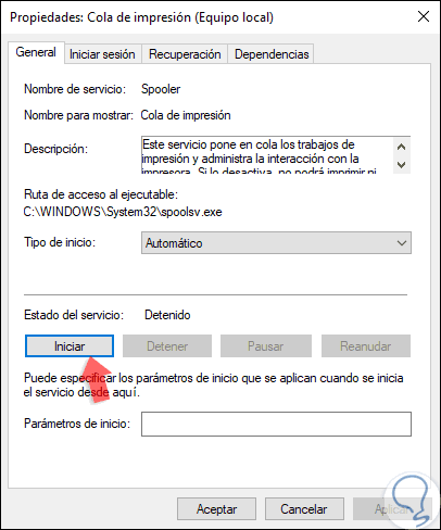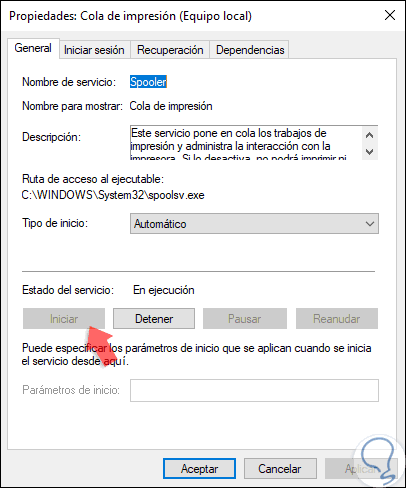 Algunos errores pueden ser corregidos deteniendo la cola de impresión e iniciándola nuevamente, de modo que una vez el servicio este detenido pulsamos en el botón “Iniciar” para restablecer de nuevo el servicio y comprobar la impresión, debería estar resuelto el problema: